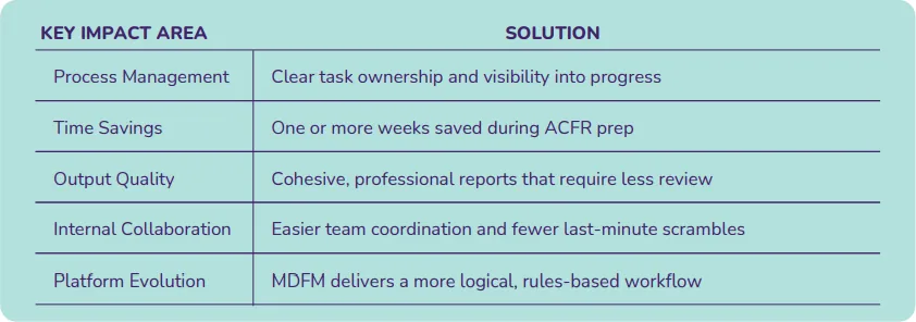 With MDFM in place, Collier saved at least a week in ACFR preparation. More importantly, they gained visibility and peace of mind. โI can assign a task, see whoโs working on it, and track progress without asking โWhere are we at?โ all day. Thatโs huge.โ