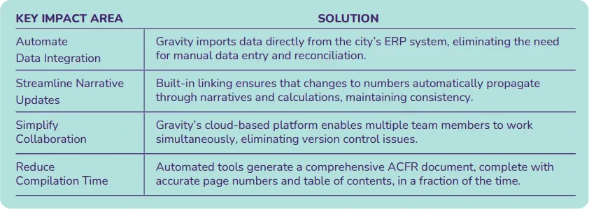 To address these challenges, the City of Columbus implemented Gravityโs ACFR solution, leveraging its robust automation capabilities to: