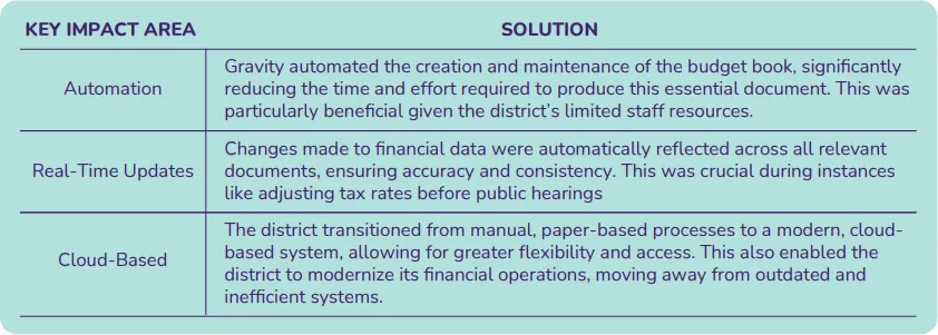 The district relied on Word and Excel to compile their budget book, resulting in a labor-intensive process prone to errors and inefficiencies. The process was so cumbersome that it could take up to 25 minutes just to open the budget file due to its size and complexity.