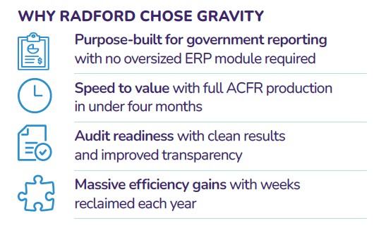 In 2024, a peer referral from the University of Virginia introduced Radford to Gravity. After a rapid evaluation, the team signed in June and went live by October with Gravity Disclosure Studio, just in time for their state reporting deadline. Gravityโs modern ACFR and GASB solutions replaced the brittle Access build with centralized data, automated footnote and MD&A generation, and built-in validation checks. โThey hit every single milestone. The only thing that could have slowed them down was us,โ said Sentman.