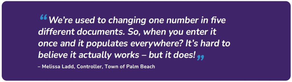 The Town of Palm Beachโs finance team was trapped in survival mode. With just one staff member handling budget and payroll, they spent +90 days a year piecing together spreadsheets and Word documentsโleaving no room for the strategic work they wanted to pursue.