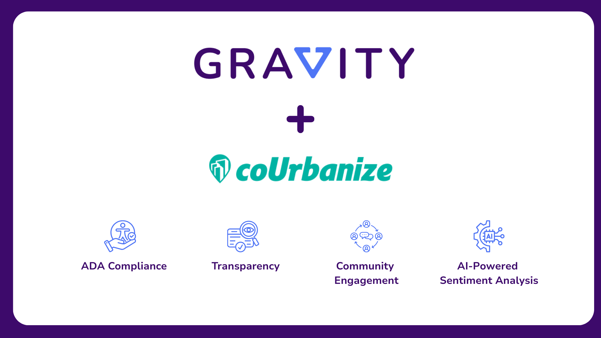 coUrbanize adds a suite of engagement tools to Gravityโs platform, including built-in translation, ADA compliance, and multi-channel feedback through comments, texts, emails, and live polling. Its AI-powered reporting distills community sentiment into insights that link directly to budgeting and planning. With new ADA mandates set to take effect in 2026, the acquisition strengthens Gravityโs ability to help governments meet these requirements through an integrated solution that transforms financial data into an ADA-compliant transparency and engagement portal.ย